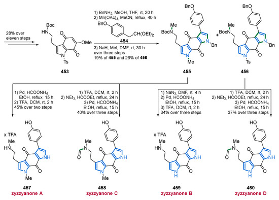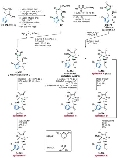 - Movassaghi, M.; Siegel, D.S.; Han, S. Total Synthesis of All (−)-Agelastatin Alkaloids. Chem. Sci. 2010, 1, 561–566. [Google Scholar] [CrossRef][Green Version]