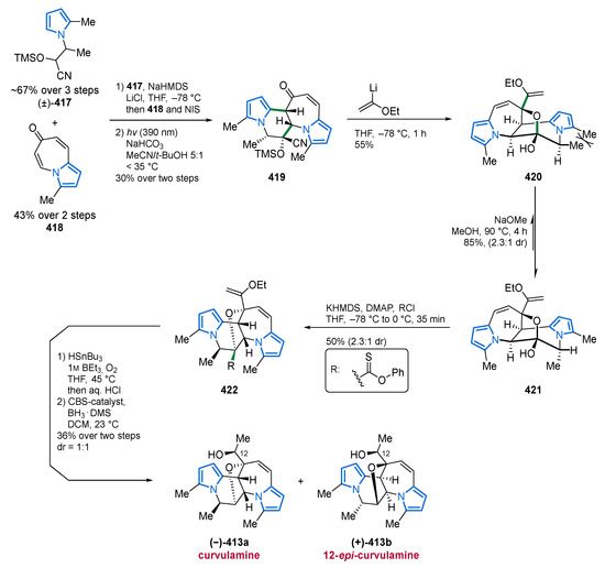 - Xuan, J.; Haelsig, K.T.; Sheremet, M.; Machicao, P.A.; Maimone, T.J. Evolution of a Synthetic Strategy for Complex Polypyrrole Alkaloids: Total Syntheses of Curvulamine and Curindolizine. J. Am. Chem. Soc. 2021, 143, 2970–2983. [Google Scholar] [CrossRef] [PubMed]