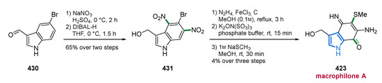Bisindole pyrroles represent a class of MNPs having similar biological activities. The lynamicins F (59) and G (60) were isolated from a marine-derived Streptomyces sp. SCSIO 03032 [84], extending the lynamicin family, of which lynamicins A–E have been isolated back in 2008 (Figure 8) [85]. Unfortunately, no antimicrobial or cytotoxic activities were observed for 59 and 60 against several indicator strains or cancer cell lines. In 2017, the first total synthesis of the antimicrobial lynamicin D (72) was achieved, thereby enabling the implementation of further biological assays (Scheme 5). It turned out that lynamicin D (72) influenced the splicing of pre-mRNAs by upregulating the level of the key kinase SRPK1, which is involved in both constitutive and alternative splicing [86].