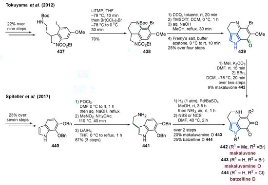 - Oshiyama, T.; Satoh, T.; Okano, K.; Tokuyama, H. Total Synthesis of Makaluvamine A/D, Damirone B, Batzelline C, Makaluvone, and Isobatzelline C Featuring One-pot Benzyne-mediated Cyclization–functionalization. Tetrahedron 2012, 68, 9376–9383. [Google Scholar] [CrossRef]