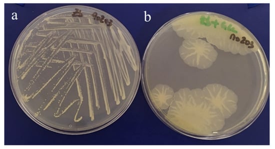 Culture of strain Mo 203 on Zobell-agar medium (a) and glucose-supplemented (30 g L−1) Zobell-agar medium (b).
