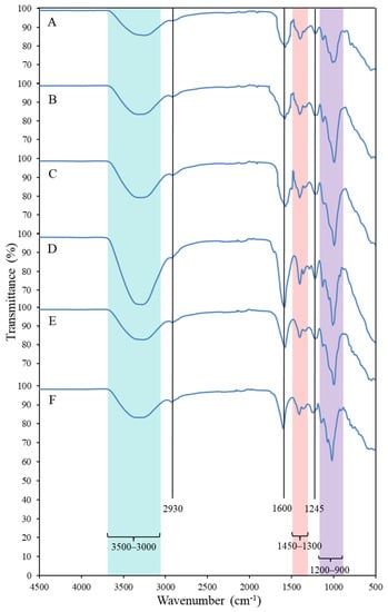 After the purification process, the EPS samples presented some content of protein and inorganic salts (Table 2). The presence of a residual protein content (1.7–6.8 wt%) in the EPS was previously reported for EPS produced by other Alteromonas strains (0–8 wt%) [,,,]. The inorganic salts content of EPS B, C, and E (15.0–34.7 wt%) was similar to those reported (15.5–40 wt%) for A. hispanica F32 [] and Alteromonas sp. PRIM-28 [], whereas EPS A, D, and F had a comparatively lower content (7.7–13.7 wt%).