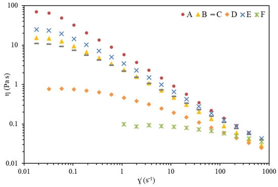 The flow curves obtained for purified EPS solutions (1 wt%) are presented in Figure 4. It can be observed that the EPS have diverse thickening capacities, as they show different values of apparent viscosity for the same shear rate, with the following order: A > E > B~C > D > F. This trend is clearly visible at the lower shear rate values tested, where the curves present or approach the first Newtonian plateau at which a high degree of polymer chains interactions (e.g., entanglements) is expected, and the molecules show high flow resistance and thereby higher viscosity [,].