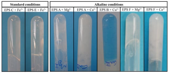 The gel forming capacity of the EPS was tested by preparation of cation-mediated gels using divalent cations (FeSO4·7H2O, Honeywell Fluka, Seelze, Germany, CuSO4·5H2O, AppliChem Panreac, Barcelona, Spain, CaCl2·2H2O, AppliChem Panreac, Barcelona, Spain, and MgSO4·7H2O, BioChem Chemopharma, Cosne sur Loire, France) and a trivalent cation (FeCl3·6H2O, Alfa Aesar, ThermoFisher, Kandel, Germany). The gelation studies were performed according to the procedure described by Shimada et al. [], with minor modifications: 5 mL of EPS solution (5 g L−1) was added to the metal salt (10 mg of cation) and agitated until dissolution and gel formation was assessed (standard conditions). Afterwards, 1 mL of NaOH (2 M) was added and the solution was agitated to test gelation in alkaline conditions. Gel formation was assessed by visual inspection, and the gels were categorized according to their strength and homogeneity: (+) for homogeneous gels that maintained their gel structure in a tube-inversion test, (-) for homogeneous gels that did not sustain their structure in the inversion test, and (--) for small non-homogeneous gels.