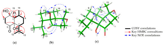 Compound 1 was obtained as colorless gum. The HRESIMS spectrum of 1 exhibited a sodium adduct ion peak at m/z 277.1782 [M+Na]+ (calcd for C15H26O3Na+ 277.1774) (Figure S1), indicating the molecular formula C15H26O3. The 1H-NMR spectrum of 1 in CDCl3 (Table 1, Figure S3) exhibited signals ascribed to an isopropyl group at δH 1.76 (m, H-11), 0.95 and 0.72 (each d, J = 6.5 Hz, H-12 and H-13), two other methyl groups at δH 1.43 (s, H-15) and 1.16 (d, J = 6.5 Hz, H-14). The evidence of the placement of ketone group was provided by the deshielded chemical shift of the proton resonance of H-4 at δH 2.75 (ddd, J = 15.3, 9.6, 4.7 Hz) and 2.53 (ddd, J = 15.3, 8.9, 4.3 Hz) which were ascribable to a neighboring group effect from a ketone group. Fifteen carbon signals were observed in the 13C-NMR spectrum of 1, including one ketone group (δC 213.5, C-5), two quaternary oxygenated carbons (δC 72.9, 77.5, C-2 and C-6, respectively), and twelve other resonances which were classified unambiguously by HSQC analysis as four methyls, four methylenes, and four methines (Figure S6). The substituted moieties of 1 were similar to those of cadinanes, but COSY and HMBC analysis suggested a different skeleton. The locations of the methyl group at C-10 and the isopropyl group at C-7 were determined by COSY spectrum with a continuous spin system from H-1-H-10-H-9-H-8-H-7-H-11-H-12, H-14-H-10 and H-11-H-13 (Figure S5); and the strong HMBC correlations of H-14 (δH 1.16) to C-1 (δC 51.0), C-10 (δC 29.1), C-9 (δC 31.2), and H-12 (δH 0.95), H-13 (δH 0.72) to C-7 (δC 47.9), C-11 (δC 26.5) (Figure S7). Interestingly, the HMBC spectrum showed cross-peaks between H-15 (δH 1.43) and C-3 (δC 39.7), C-2 (δC 72.9), C-1 (δC 51.0), revealed the unusual position of methyl group C-15. This fact suggested that the planar architecture of 1 possessed an undescribed rearranged cadinane skeleton.