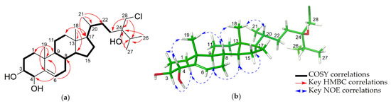 The molecular formula of compound 3 was identified as C28H47ClO3 based on HRESIMS data (Figure S35) at m/z 489.3110 [M + Na]+ (calcd for C28H47ClNaO3+ 489.3106). The 1H-NMR spectrum of 3 (Figure S36) showed one olefinic proton at δH 5.74 (dt, J = 2.1, 4.9 Hz, H-6), two oxygenated methines at δH 3.27 (ddd, J = 11.3, 9.4, 4.7 Hz, H-3) and 4.06 (dd, J = 9.4, 2.7 Hz, H-4), one chlorinated methylene at δH 3.68 (d, J = 11.2 Hz, H-28a) and 3.56 (d, J = 11.2 Hz, H-28b), and 5 methyl groups at δH 0.69 (s, H3-18), 1.02 (s, H3-19), 0.93–0,95 (9H, overlap, H3-21, H3-26, H3-27). The 13C and HSQC spectroscopic data (Figures S37 and S39) indicated that 3 contained five methyls, ten methylenes, nine methines, and four quaternary carbons, suggesting an ergostane-type steroid. The NMR spectroscopic data of the tetracyclic moiety closely resembled those of 3β,4α-dihydroxyergosta-5,24(28)-diene [9], indicating that 3 had two hydroxy groups at C-3 and C-4, and a double bond between C-5 and C-6. The proposed structure was confirmed by COSY data (H2-1/H2-2/H-3/H-4), and HMBC correlations of H3-19 to C-5, and H-6 to C-4, C-7, C-8, C-10 (Figure 4a). The relative configuration of 3 was also similar to the reference compound 3β,4α-dihydroxyergosta-5,24(28)-diene [9], which was supported by the 1H-1H coupling constants and NOE analysis. The hydroxyl groups at C-3 and C-4 were deduced as β- and α-forms, respectively, by observation of large diaxial coupling constants (J = 9.4 Hz) between H-3 and H-4, and NOE correlations of H-4/H3-19, H-3/H-1α, H-1α/H-9 (Figure 4b). A chlorinated methylene (C-28) of the side chain in compound 3 was unique, which was confirmed by molecular ion clusters at m/z 489.3106 (65%), 491.3093 (35%). The location of the chlorinated methylene and oxygenated quaternary carbon were identified by HMBC analysis, where the correlations of H2-28 to C-23, C-24, C25 and H3-26, H3-27 to C-25, C-24 were observed. The absolute configuration of C-24 was conducted by the gauge-including atomic orbital (GIAO) NMR chemical shifts calculation supported by DP4+ analysis (Tables S3–S5). The calculated 1H and 13C NMR chemical shifts of the diastereomers 24S and 24R were compared with those of the experimental NMR data of 3 using the advanced statistics DP4+ (Table 3 and Table S5). The DP4 + analyses demonstrated the probability of 24R is 100.0% (Table 3, Table S5). Consequently, the structure of 3 was elucidated as (24R)-28-chloroergost-5-ene-3β,4α,24-triol.