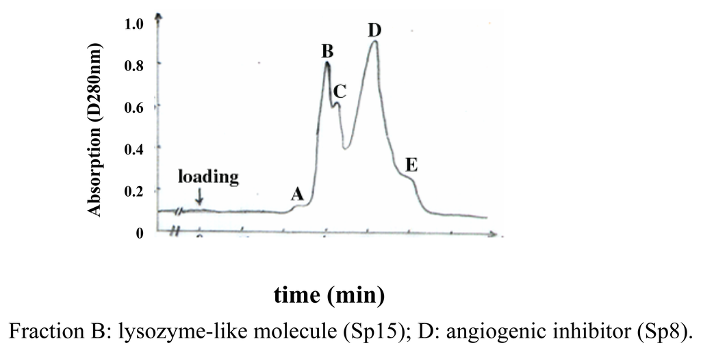 Neovascularization is highly correlated with the rapid growth and metastasis of solid tumors. Various angiogenic inhibitors including angiostatin, endostatin, THP-470, metalloproteinase inhibitors and Bufotanine as the therapeutic intervention for angiogenesis are being tested for the treatment of cancers [1]. Recently, Genentech developed a humanized monoclonal antibody to VEGF (Bevacizumab, Avastin); it is now under Phase III clinical trails for the treatment of colorectal, breast, and non-small cell of the lung cancer [2]. Several studies have indicated that shark cartilage is endowed with effective angiogenic inhibition and anti-tumor activities [3–5], the molecular mechanisms for which remain unclear however. This investigation describes the separation and purification of shark cartilage-derived proteins, and the screening for active molecules via tests for in vitro vascular endothelial cell proliferation-inhibition, in vivo angiogenic inhibition and in vivo anti-tumor activity on mice-bearing transplanted sarcoma 180 (S180).