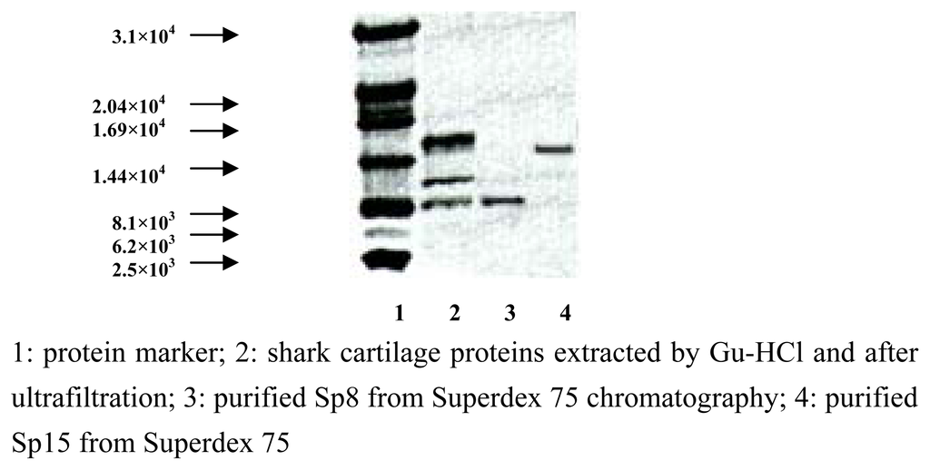 Previous studies on shark cartilage-derived active protein(s) [3–7] indicated that the molecular weights of the main active components seemed to be less than 3.0×104 Da, which prompted us to investigate the composition and activities of lower molecular mass species. Several extraction protocols including ultrafiltration and column chromatography have been attempted to isolate and identify the active fractions from shark cartilage(see the part of Experimenatal), and our data showed that Sp15 was the predominant component in shark cartilage, accounting for approximately more than 50% w/w in extracts, whereas Sp8 accounted for ~20%. Superdex 75 chromatography yielded the highly purified Sp15 and Sp8 in the fractions designated B and D, respectively (Figure 1). A Tricine-SDS-PAGE was used to determine their apparent molecular masses as 1.52×104 Da for Sp15 and 8.3×103 Da for Sp8, respectively (Figure 2).