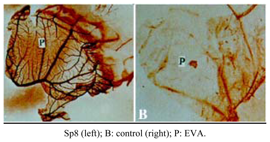 A MTT test was used for determining the inhibition of endothelial cell proliferation. Inhibition of angiogenesis on rabbit cornea model was performed according to Langer, et al [15]: lipopolysaccharide (LPS, endotoxin, 140 μg) isolated from Salmonella abortus equi was mixed with Sp8 (40 μg) into ethylene-vinyl acetate (EVA) to prepare the sustained releasing compound and then transplanted into rabbit cornea; 10 d later, the result of angiogenic inhibition was recorded. Chick embryo chorioallantoic membrane (CAM) model was also used to assess the inhibition of angiogenic effect of Sp8 according to Taylor, et al [16]: Sp8 was mixed into EVA to prepare the sustained releasing compound and transplanted into the capillary-free area of CAM of chick embryo at 9 d old of age; 3 d later, it was taken out and the result of the inhibition were recorded. In vivo tumor growth inhibition test was performed as the routine procedure.