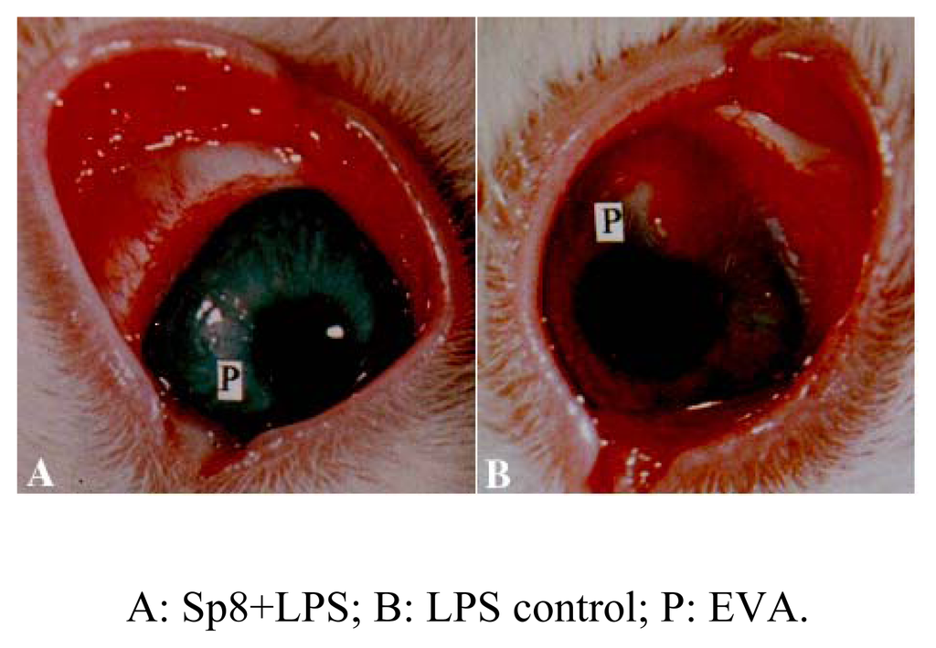 We observed Sp8-mediated angiogenic inhibition on two models, rabbit cornea and chick embryo CAM models, respectively. Both have been used extensively in the angiogenic inhibitor research. The results showed that Sp8 exhibited a strong inhibitory effect up to a rate of 79.0% on the CAM model (Figure 3) and 72.7% on rabbit cornea model (Table 1, Figure 4) at the dose of 40.0 μg, respectively. No obvious dose response relationship has been observed at the range of 20.0~160.0 μg. The results indicate that Sp8 is a potent angiogenic inhibitor present in shark cartilage. In the same test model, Sp15 showed no angiogenic inhibition in vivo.