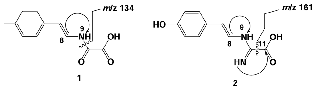 Hamigeramine ([2-(4-Hydroxy-phenyl)-vinylamino]-imino-acetic acid) (2): yellowish white powder; UV λmax (MeOH) nm 226.7, 324.0; 1H NMR and 13C NMR (DMSO-d6): Table 1; (+) FABMS m/z 207.1 [M+H]+, 229 [M+Na]+; (+) ESIMS (ion trap) m/z 207.1 [M+H]+, 412.9 [2M+H]+; (−) ESIMS (ion trap) 205.4 [M–H]−, 411.5 [2M–H]−, 617.1 [3M–H]−. The results of the MS/MS fragmentation of the (+) and (−) ESIMS (ion trap) are shown in Figure 2.