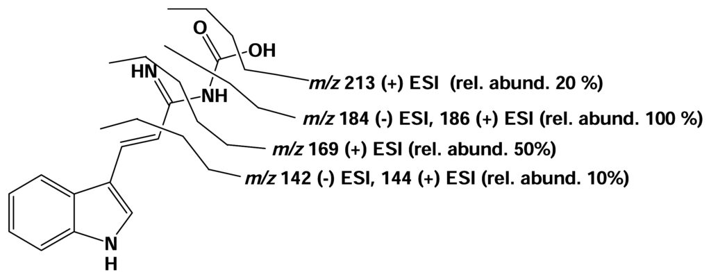 Hamigeramide (3) was obtained as a yellowish white powder from the biologically active EtOAc extract. It has the molecular formula of C12H11N3O2 as suggested by EIMS. Its 1H NMR spectrum (Table 2) was very similar to those of 3-indoleacrylamide and its acid congener [22] except for the difference in signals observed for the 1,2-trans-disubstituted olefinic protons. The 13C data for 3 were obtained from a HMBC spectrum and significant differences compared to the known compounds were observed for the olefinic carbons. The 1H signals of the olefinic system of indoleacrylamide and its acid congener were observed at ca. 6.80 and 8.00 ppm while their carbon shifts were detected at ca. 115 and 138 ppm. The same chemical shifts were also observed for the bis-indole alkaloids, chondriamides, isolated from the red alga Chondria atropurpurea [10, 23]. The functionality common to both the chondriamides and indoleacrylamide is the presence of a carbonyl moiety adjacent to the trans olefinic bond. The 1H signals of the olefinic system of hamigeramide (3) were observed at 7.18 and 7.10 ppm while their carbon shifts were detected at 118.2 and 117.3 ppm which suggested that 3 had a unique terminal functionality. Since the 1H and 13C chemical shifts of the olefinic protons were comparable to those of hamigeramine (2), this could suggest the presence of an adjacent imino amino moiety. Due to the very small amount of hamigeramide isolated, it was not possible to obtain a 13C NMR spectrum to prove the presence of the imino group. The HMBC spectra also did not show any discernible correlation between any of the olefinic protons to the expected imino carbon chemical shift at ca. 155 ppm. Ion trap ESI MS/MS showed the presence of the imino amino moiety and its connectivity were confirmed (Figure 3). ESIMS fragmentation positive mode of the [M+H]+ ion at m/z 230.21 gave a major daughter ion peak at m/z 186.1 [M–CO2H]+ which indicated the loss of the terminal acid unit, followed by subsequent loss of an NH3 unit (m/z 169.3) and C=NH (m/z 144.1). This was confirmed by the (−) ESIMS fragmentation of the [M–H]− ion at m/z 228.62 which gave a major daughter ion peak at m/z 184.1 [M–CO2H]−. The daughter ion peak at m/z 169.3 in the (+) ESIMS fragmentation also indicated the absence of an enamide unit as in hamigeroxalmic acid (1) and hamigeramine (2) which further suggested that the imino unit was adjacent to the 1,2-trans disubstituted double bond. This accounted for the relatively sharp doublet of both the olefinic protons in the 1H NMR spectrum of hamigeramide (3) compared to hamigeramine (2). The fragmentation pattern suggested an imino carbamic acid terminal moiety and thus hamigeramide was elucidated as 1-imino-3-(1H-indol-3-yl)-allyl]-carbamic acid.