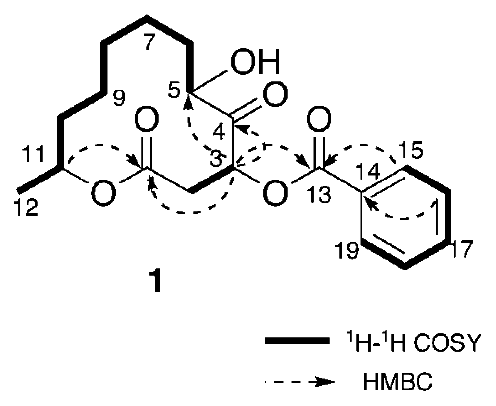 Analysis of the 1H-1H COSY spectrum (Figure 1) revealed connectivities of C-2 to C-3 and C-5 to C-12. HMBC correlations of H-3 (δH 5.90) to C-1 (δC 168.8), C-4 (δC 207.1), and C-5 (δC 76.0) and H-11 (δH 4.89) to C-1 indicated that 1 possessed a twelve-membered macrocyclic lactone with a ketone group at C-4 and a hydroxy at C-5. An HMBC correlation between H-3 to C-13 (δC 165.5) revealed that the benzoyl group was attached to C-3. Thus, the structure of sporiolide A was assigned as 1, which corresponded to be a 3-O-benzoyl form of pandangolide 1 [7].