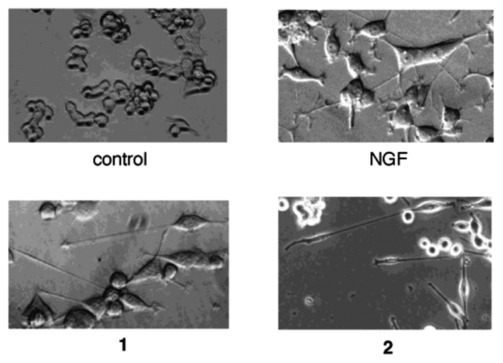 Effects of 1, 2, and NGF on neurite outgrowth in PC-12 cells. PC-12 cells were incubated for 2 days in the absence (control) or presence of NGF (positive control) at 50 ng/mL, 1 at 25 μg/mL, or 2 at 50 μg/mL.