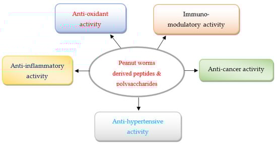 Several recent studies have demonstrated that the peptides and polysaccharides obtained from peanut worms possessed numerous health benefiting functions, namely, anti-inflammatory, anti-hypertensive, immunomodulatory, anti-cancer, wound healing, anti-oxidant and anti-hypoxia activities [14,15,16,17,18,19,20] (Figure 1). However, the biological properties of peptides and polysaccharides of peanut worms have not been reviewed in the literature so far. This prompted the authors to review the literature on various bioactivities of peptides and polysaccharides derived from peanut worms and their molecular mechanisms of action.