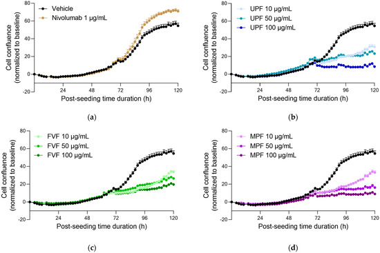Real-time live cell monitoring of activated PBMCs, under treatment with fucoidans. PBMCs were seeded in the presence of αCD3 (0.50 μg/mL), and treated with increasing doses of Nivolumab, as positive control (p < 0.05) (a), UP (p < 0.001) (b), FV (p < 0.001) (c), and MP (p < 0.001) (d). Cell confluence was monitored and quantified—as a surrogate of cell proliferation, over a period of ~5 days. Data were normalized and corrected to the baseline and are expressed as means ± SEM.