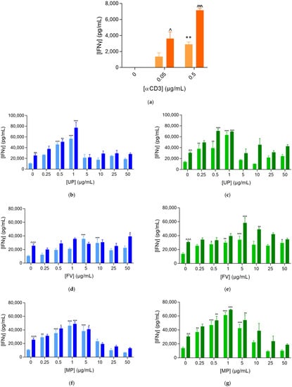 The level of IFNγ was slightly increased in the presence of all fucoidans (Figure 1b–d). UP at 50 µg/mL had the highest level of IFNγ (Figure 1b). Under αCD3 stimulation, all fucoidans promoted a strong PBMC activation. The maximal enhancing effect observed was obtained from the lower tested dose at 10 µg/mL and the effect then decreased gradually and reached the baseline level for UP and MP at 100 µg/mL (Figure 1b,d). For FV, PBMC response remained strongly enhanced regardless of the dose.