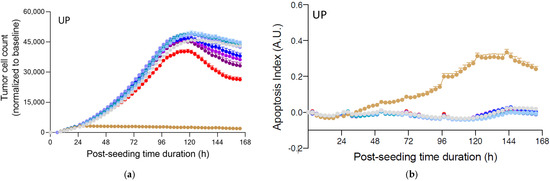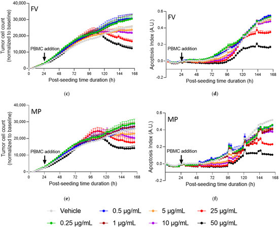 Real-time live cell monitoring of prostate PC3 tumor cell killing mediated by activated PBMCs, under treatment with test compounds. Prostate PC3 tumor cells were seeded and 24 h later were co-cultured with PBMCs, in the presence of αCD3 (0.5 µg/mL), and in the presence of Nivolumab (1 µg/mL), and treated with increasing doses of each of test compounds—UP (a,b), FV (c,d), and MP (e,f). Tumor cell count (a,c,e) and apoptosis (b,d,f) were monitored and quantified over a period of ~5 days, by means of a NucRed probe expression and caspase 3/7 fluorescent probe, respectively, as surrogate measures of immune cell killing activity towards tumor cells. Apoptosis is represented as an index evaluated with respect to the apoptosis events and cell number in each condition. Data were normalized and corrected to the baseline and are expressed as means ± SEM (p < 0.001).