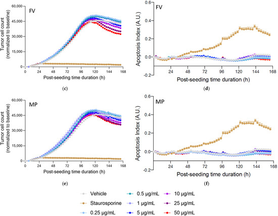 Real-time live cell monitoring of PC3 tumor cell cultures under treatment with fucoidan. PC3 tumor cells were seeded and 24 h later treated with increasing doses of—UP (a,b), FV (c,d), and MP (e,f). Tumor cell count (a,c,e) and apoptosis (b,d,f) were monitored and quantified over a period of ~5 days, by means of NucRed probe expression and caspase 3/7 fluorescent probe, respectively. Apoptosis is represented as an index evaluated with respect to the apoptosis events and cell number in each condition. Data were normalized and corrected to the baseline and are expressed as means ± SEM (p < 0.001).