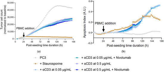 Real-time, live-cell monitoring of prostate PC3 tumor cell killing mediated by activated PBMCs in untreated and Nivolumab-treated conditions. Prostate PC3 tumor cells were seeded and 24 h later were co-cultured with PBMCs, in the presence of αCD3 at 0.05 or 0.5 µg/mL, in the presence and absence of Nivolumab at 1 µg/mL. Tumor cell count (a) and apoptosis (b) were monitored and quantified over a period of ~5 days, by means of NucRed probe expression and caspase 3/7 fluorescent probes, respectively, as surrogate measures of immune cell killing activity towards tumor cells. Apoptosis is represented as an index evaluated with respect to the apoptosis events and cell number in each condition. Data were normalized and corrected to the baseline and are expressed as means ± SEM (p < 0.05).