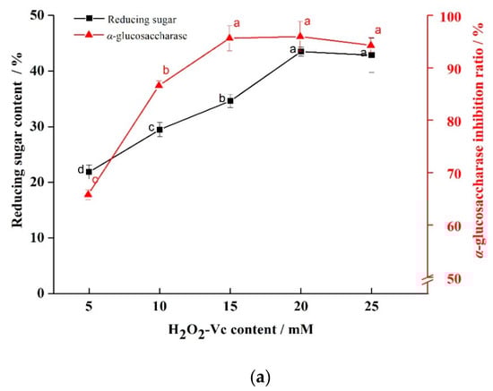 In order to study the effect of time on degradation, the concentration of H2O2-Vc was 20 mM (attained from Figure 1a), the temperature was 50 °C, and the time was 0.1, 0.3, 0.5, 0.7, and 0.9 h. The reducing sugar content and α-glucosidase inhibition rate were taken as indexes. The results (Figure 1b) showed that the reducing sugar content and α-glucosidase inhibition rate were the highest when the time was 0.5 h.