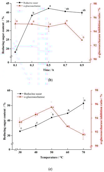 On the basis of the above experiments (H2O2-Vc concentration was 20 mM and time was 0.5 h), temperature of 30, 40, 50, 60, and 70 °C were selected to explore the influence of temperature on the degradation. The results showed that the reducing sugar content and α-glucosidase inhibition rate were higher when the temperature was 50 °C (as seen in Figure 1c).