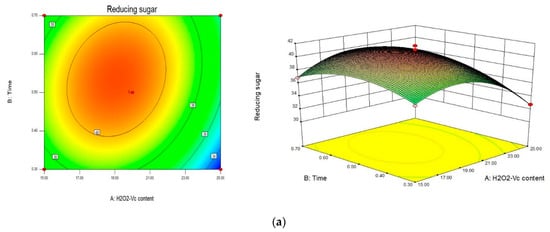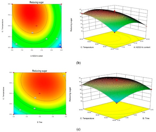 Figure 2 showed the contour map and response surface map of the degradation products of GLP. The contour maps of Figure 2a,b were oval, and (c) was circular. The response surface slope of (a) and (b) were larger than (c). These results indicated that H2O2-Vc concentration had significant interaction with reaction time, and H2O2-Vc concentration had remarkable interaction with temperature, while the interaction between reaction time and temperature was not obvious, which was consistent with the results of regression model analysis.