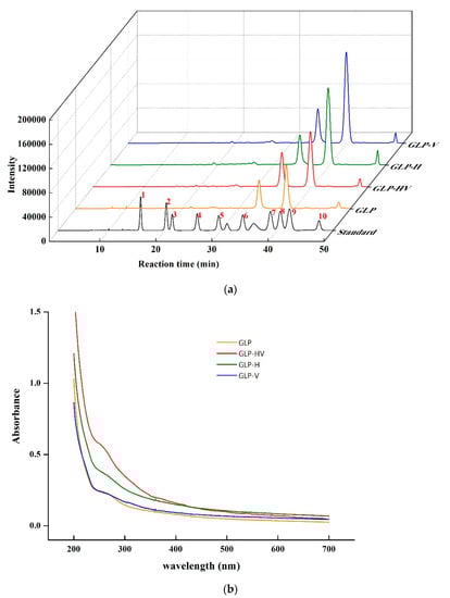 Four polysaccharide samples were respectively scanned under UV-visible spectroscopy at 200–700 nm. As shown in Figure 3b, GLP, GLP-HV, GLP-H, GLP-V showed no absorption at 260 nm and 280 nm, indicating that there were no nucleic acid and proteins before and after the degradation of the polysaccharide, which was consistent with the determination results of protein content in Table 4.