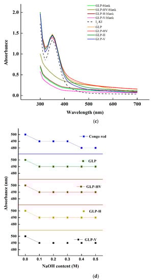 Congo red is an acidic dye soluble in water and alcohol. When it combines with the triple helix structure of polysaccharide to form a conjugate, its maximum absorption wavelength will be redshifted. However, when the concentration of NaOH increases, the complex formed by Congo red and the triple helix structure of polysaccharide will be destroyed, forming irregular curls, and the maximum absorption wavelength will first increase and then decrease []. From Figure 3d, GLP, GLP-HV, GLP-H, and GLP-V did not appear the phenomenon of redshifted, which were consistent with the change of pure Congo red. The results demonstrated that there was no triple helix structure in polysaccharide before and after the degradation.