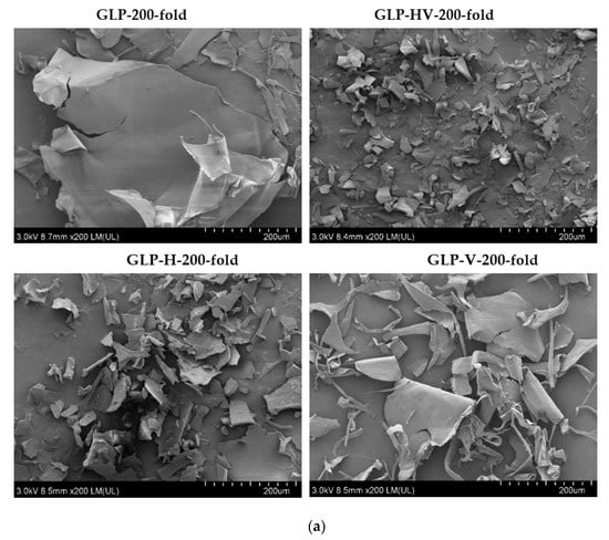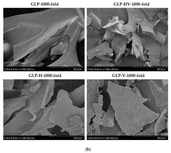 The surface morphology analysis of GLP and its degradation products were explored by scanning electron microscope (SEM). The SEM images of GLP, GLP-HV, GLP-H, and GLP-V were observed in Figure 4. The SEM images at 200-fold (Figure 4a) and 1000-fold (Figure 4b) magnification indicated that the surface morphology of GLP was smooth, compact, and flaky. After the degradation with H2O2 and Vc, the polysaccharide structure was damaged, loose, and broken. The structure of GLP-V (treated by Vc) was damaged and became irregular (in the shapes of strips and flakes), but the surface was also smooth, compared with GLP. However, the structure of polysaccharide treated by H2O2 was broken, and its surface became rough and loose (GLP-H). The effect of H2O2-Vc degradation was more obvious, the structure was the most loose, and the damage for surface structure was the most serious, but the size of fragments was relatively uniform. The polysaccharide structure degraded by H2O2-Vc was more fragmented and looser. The morphologies of the polysaccharide produced by H2O2 degradation alone were similar to those treated by H2O2-Vc degradation, but the structures of the polysaccharide produced by H2O2-Vc were more uniform and fragmented. The probable reason was that H2O2 had a major effect on the structure of polysaccharide, while Vc played a supplementary role. Vc could promote H2O2 to generate more free radicals, breaking glyosidic bonds, so that the structure of polysaccharide became loose and broken [].