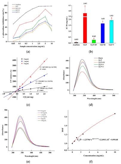 The inhibition effect of GLP and its degradation products on α-glucosidase. Note: (a) The α-glucosidase inhibition rate of GLP, GLP-HV, GLP-H, and GLP-V; (b) The IC50 value of α-glucosidase inhibition rate of GLP, GLP-HV, GLP-H, and GLP-V; (c) The Lineweaver–Burk curve of α-glucosidase inhibitory dynamics of GLP, GLP-HV, GLP-H, and GLP-V; (d) The fluorescence spectrum analysis on α-glucosidase of GLP, GLP-HV, GLP-H, and GLP-V; (e) The fluorescence spectrum analysis on α-glucosidase of GLP-HV; (f) The Stern-Volmer curve for fluorescence quenching of GLP-HV on α-glucosidase a, b, c, d and e represented significant differences among groups, and p < 0.05 indicates significant differences.