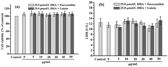 Cytotoxicity of fucoxanthin and lutein on RPE cells under a lipid-rich environment: (a) cell viability; (b) lactic dehydrogenase (LDH) levels. The DHA concentration was 25.0 μmol/L.