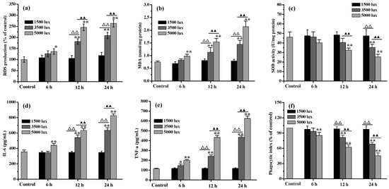 The effects of visible light exposure on oxidative damage, inflammation and phagocytosis in differentiated RPE cells: (a) intracellular ROS levels; (b) intracellular MDA levels; (c) SOD activity; (d) inflammatory factor IL-6; (e) inflammatory factor TNF-α; (f) phagocytic index. (* p < 0.05 and ** p < 0.01 vs. control; ΔΔ p < 0.01 means 1500 vs. 3500 lux; ▲▲ p < 0.01 means 3500 vs. 5000 lux).