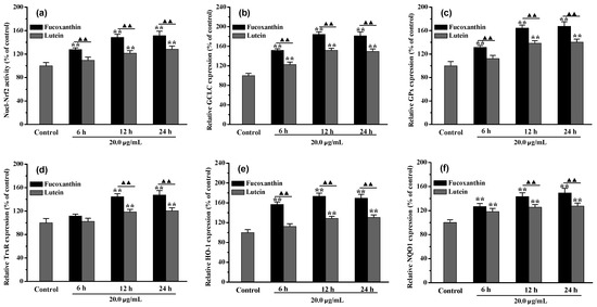 The effect of pretreatment time on Nrf2 signaling pathway activated by fucoxanthin in differentiated RPE cells. (a) Nucl-Nrf2 activity; (b) GCLC expression level; (c) GPx expression level; (d) TrxR expression level; (e) HO-1 expression level; (f) NQO1 expression level. (** p < 0.01 vs. control; ▲▲ p < 0.01 vs. lutein).