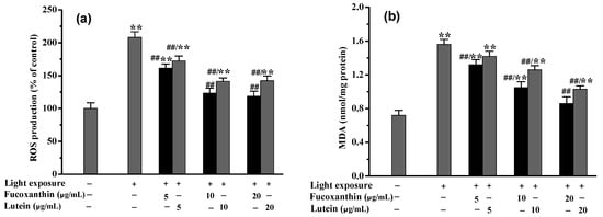 The MTT assay and LDH release assay were employed to measure cell viability and cell membrane integrity, respectively, according to a previous study [23]. Briefly, RPE cells were plated in 96-well plates at the concentration of 5 × 105 cells/mL for incubation 48 h. The cells were then treated with serum-free F12 medium containing 25.0 μmol/L DHA and different concentrations of fucoxanthin or lutein. After 24 h incubation, the cell supernatant was collected for LDH analysis. Subsequently, 150 µL of serum-free F12 medium containing 0.50 mg/mL MTT was added into each plate well and incubated for 4 h. The medium was then replaced with dimethyl sulfoxide (DMSO), and the absorbance was measured at 570 nm. The LDH activity in the cell supernatant was determined using a commercial LDH kit, according to the manufacturer’s instructions.