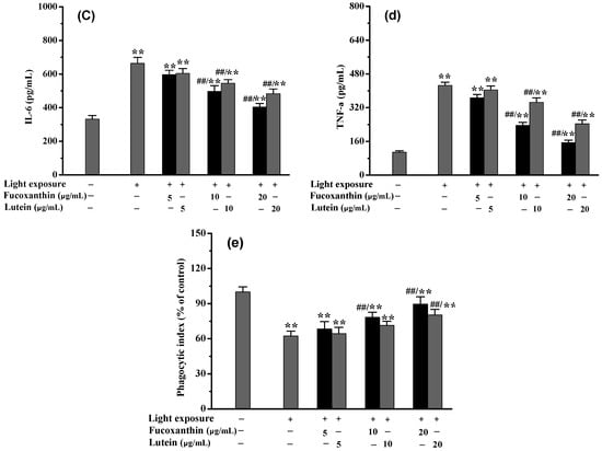 Inhibitory effects of fucoxanthin on oxidative damage and phagocytosis disorder in RPE cells induced by visible light: (a) intracellular ROS levels; (b) intracellular MDA levels; (c) inflammatory factor IL-6; (d) inflammatory factor TNF-α; (e) phagocytic indexes. (** p < 0.01 vs. control; ## p < 0.01 vs. light exposure).