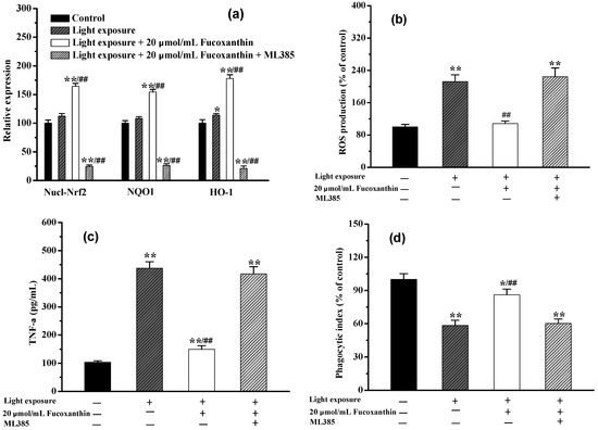 Ameliorative effects of fucoxanthin on phagocytosis disorder in RPE cells via the Nrf2 signal pathway: (a) the expressions of Nucl-Nrf2, NQO1, and HO-1 when RPE cells were treated with fucoxanthin or fucoxanthin +ML385; (b) ROS production when RPE cells were treated with fucoxanthin or fucoxanthin + ML385; (c) TNF-α levels when RPE cells were treated with fucoxanthin or fucoxanthin +ML385; (d) phagocytic indexes when RPE cells were treated with fucoxanthin or fucoxanthin +ML385. (* p < 0.05 and ** p < 0.01 vs. control; ## p < 0.01 vs. light exposure).