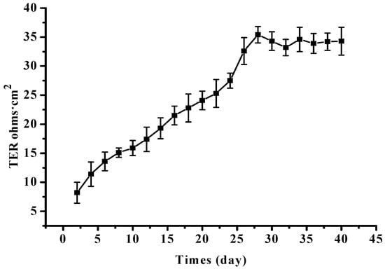 The differentiated RPE cell monolayer was cultured as described in previous studies [39,40]. RPE cells at passage 4 were seeded onto transwell inserts with polyester membranes (6.5 mm diameter, 0.4 μm pores) from Corning Inc. (Corning, NY, USA), at a seeding density of 1 × 104 cells per well (about 30,000 cells/cm2). In the apical and basolateral chambers, 200.0 and 600.0 μL of serum-free F12 media were added, respectively. The cultures were supplied with 5% CO2 in a humidified incubator (37 °C). Transepithelial electrical resistance (TER) was used to evaluate the differentiation degree of the RPE cell monolayer (Figure 6). It was deemed to be usable for subsequent light damage experiments when the differentiated RPE cell monolayer was cultured for 4 weeks, and the net TERs were ≥25.0 Ohm·cm2 [39].
