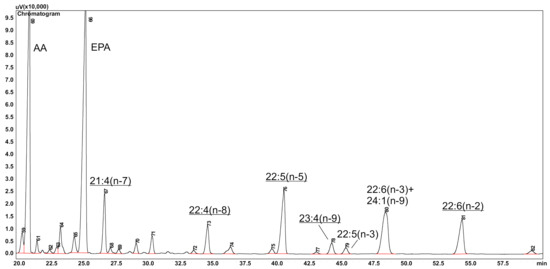 A part of the GC chromatogram of FAME from TL of the abyssal sea star Eremicaster vicinus. Conditions: Supelcowax 10 column, 30 m, at 205 °C, detector FID. FAME of 21:4(n-7), 22:4(n-8), 22:5(n-5), 23:4(n-9), and 22:6(n-2) acids had ECL values of 22.09, 22.98, 23.53, 23.82, and 24.53, respectively. Uncommon and new acids are underlined.
