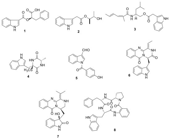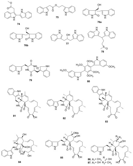 Fusariumindole B (74), a bis-indole derivative comprising two indole moieties linked through C-2 and C-2′, and fusariumindole A (75) (Figure 10) were also isolated from the extract of the marine-derived Fusarium sp. L1, cultured in L-Trp-supplemented GYP medium. Compound 74 comprises two indole moieties linked through C-2 and C-2′, while in 75, both indole moieties are linked together not directly but by an ethyl acetate ester through C-3 of the indole ring [7].