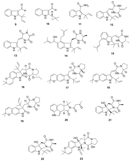 The extract of a solid rice culture of a mangrove-derived fungus Eurotium chevalieri KUFA 0006, isolated from a healthy twig of Rhizophora mucronata Poir., which was collected at Kung Krabaen Bay Royal Development Study Center, yielded two prenylated indoles, 3-carbaldehyde derivatives, namely, 2-(2-methyl-3-en-2-yl)-1H-indole-3-carbaldehyde (9) and 2-(2,2-dimethylcyclopropyl)-1H-indole-3-carbaldehyde (10) (Figure 4) [14], whereas an amide-containing eurotiumin D (11) and a diketopiperazine-containing eurotiumin C (12) (Figure 4) were obtained from the extract of a liquid culture of Eurotium sp. SCSIO F452, which was isolated from a South China Sea sediment sample [15].