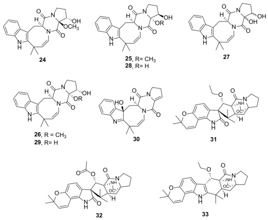 The EtOAc extract of a solid rice culture of the fungus Penicillium dimorphosporum KMM 4689, isolated from soft coral samples that were collected from various points in the South China Sea, yielded seven unreported deoxyisoaustamide derivatives, namely 16α-hydroxy-17β-methoxydeoxydihydroisoaustamide (24), 16β-hydroxy-17α-methoxydeoxydihydroisoaustamide (25), 16α-hydroxy-17α-methoxydeoxydihydroisoaustamide (26), 16,17-dihydroxydeoxydihydroisoaustamide (27), 16β,17α-dihydroxydeoxydihydroisoaustamide (28), 16α,17α-dihydroxydeoxydihydroisoaustamide (29), and 3β-hydroxydeoxyisoaustamide (30) (Figure 5). The structures of the compounds of this group are characterized by a 6/5/8/6/5 pentacyclic ring system whose indole and 1,4-diketopiperazine moieties are linked through the eight-membered hexahydroazocine ring. The structures of 24–30 were elucidated by extensive analysis of their 1D and 2D NMR spectra. The relative configurations of the stereogenic carbons in 24 were determined by single-crystal X-ray analysis whereas those of 25–30 were established by NOESY correlations. The absolute structure of 24 was based on its biogenic relationship with that of the previously described (+)-deoxyisoaustramide. The absolute configurations of the stereogenic carbons of the rest of the compounds were based on their biogenetic consideration as well as a comparison of their CD spectra [20].