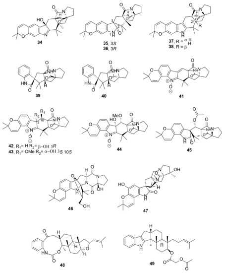 The EtOAc extract of a culture of Fusarium sp. L1 from a GPY liquid medium supplemented with L-Trp also produced fusaindoterpenes A (48) and B (49) (Figure 6). Compound 48 is a rearranged prenylated indole containing a 8,9-dihydro-1,3-oxazonine-2,6 (3H,7H)-dione ring, while 49 features an indole fused with a substituted dodecahydro-1H-cyclopenta[a]naphthalene ring system. The relative configurations of 48 and 49 were established by NOESY correlations. The absolute configurations of the estereogenic carbons of 48 were established by X-ray analysis, while those of 49 were established by a comparison of the calculated and experimental ECD spectra [7].