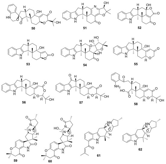 The EtOAc extract of a fermentation broth of Penicillium sp. KFD28, isolated from a bivalve mollusc, Meretrix lusoria, which was collected from Haikou Bay, China, furnished four indolediterpenoids, named penerpenes A–D (50–53) (Figure 7). Compound 50 features a hexacyclic ring system comprising 1,2-dihydro-2′H-spiro [3,1-benzoxazine-4,1′-cyclopentan]-2′-one fused with a decalin ring system, while 51–53 share a common feature, having an indole ring system fused with a cyclopentane ring of the dodecahydro-1H-cyclopenta[a]naphthalene ring system. However, the structure of 51 is unique since it has a pyridine ring fused with a decalin moiety. The planar structures of 50–53 were elucidated by extensive analysis of their 1D and 2D NMR data. The absolute configurations of the stereogenic carbons in 50 and 51 were established by comparison of the calculated and experimental ECD spectra while only the relative configurations of 52 were established by ROESY correlations. On the other hand, the absolute configurations of the stereogenic carbons in 53 were established using the ECD exciton chirality models [24]. The presence of a spiro 1,4-dihydro-2H-3,1 benzoxazine ring in 50 and the presence of a pyridine ring in 51, together with a new carbon skeleton in 52 and 53, led Kong et al. [24] to propose the biosynthesis of these compounds as a degradation and rearrangement of the carbon skeletons of paxilline-type indole terpenoids, paxilline (I) and emindole SB (VI), which were co-isolated with 50–53.