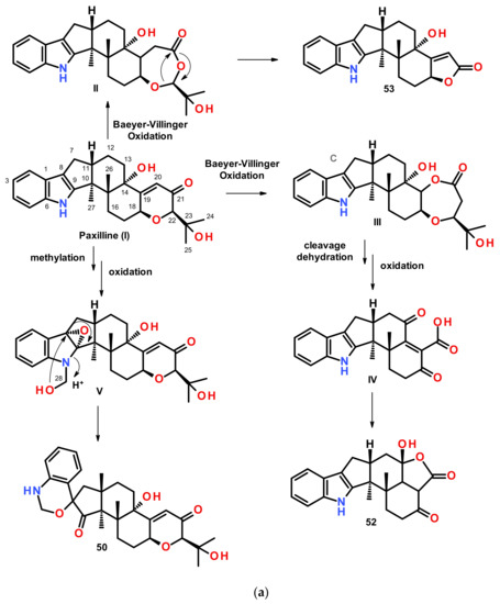 N-methylation and oxidation of the indole portion of paxilline (I) yields V with N-hydroxymethyl and an epoxide between C-8 and C-9. Nucleophillic substitution of C-8 by OH-28 with a concomitant opening of the epoxide ring and a cleavage of C-9-N leads to thee formation of a spiro 1,4-dihydro-2H-3,1 benzoxazine ring in 50. On the other hand, Baeyer–Villinger oxidation of I gives II, with a 1,3-dioxepan-4-one ring, and III, with a 1,4-dioxepan-5-one ring. Rearrangement of the 1,3-dioxepan-4-one ring in II yields 53, while ring cleavage, dehydration, and oxidation of III gives IV. Lactonization of IV yielded 52 (Figure 8a).