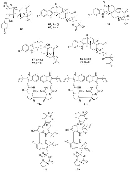 The EtOAc extract of the rice culture of Aspergillus austroafricanus Y32-2, isolated from a seawater sample, which was collected from the Indian Ocean at the depth of 30 m, yielded two diketopiperazine-containing prenylated indole dimers, di-6-hydroxydeoxybrevianamide E (72) and dinotoamide J (73) (Figure 9). The structures of the compounds were elucidated by extensive analysis of 1D and 2D NMR spectral data together with HRMS. The absolute configurations of their stereogenic carbons were established by a comparison of thee calculated and experimental ECD spectra. It is interesting to note that, unlike 71b/71b, both 72 and 73 were derived from dimerization of the activated carbon of the benzene ring of the indole moieties. However, there was a difference between the 72 and 73 resides in the indole nucleus. While 72 contains an indole nucleus substituted with a reverse prenyl group at C-2, 73 contains an oxindole whose reverse prenyl substituent is on C-3 [30].