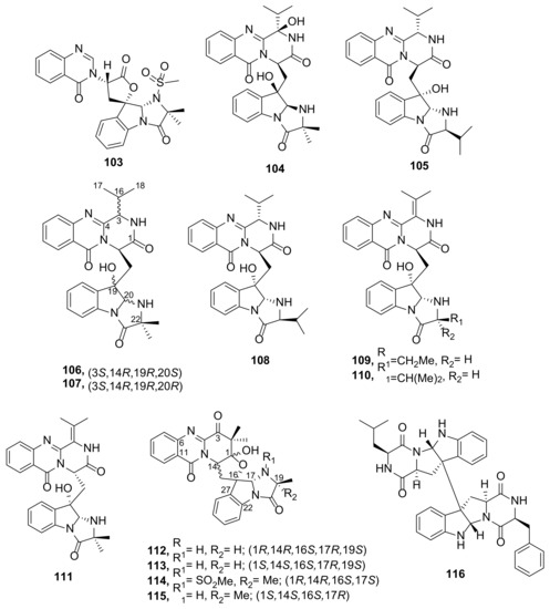 Scetryptoquivaline A (103), an N-methylsulfonyl imidazoindolone connected to quinazolinone moiety through a five-membered lactone, and scequinadoline I (104) (Figure 12), an imidazoindolone connected to an isopropyl pyrazinoquinazolinone moiety through a methylene bridge (Figure 12), were also isolated from the culture extract of a coral-associated fungus Scedosporium apiospermum F41-1 [11] while aspertoryadin H (105), another imidazoindolone connected to isopropylquinazolinone moiety through a methylene bridge, was also isolated from a mollusk-associated fungus Aspergillus sp. HNMF114 [42]. Scequinadolines A−F (106–111) (Figure 12), comprising an imidazoindolone connected to an isopropylpyrazinoquinazolinone moiety through a methylene bridge, and scedapins A-D (112–115) (Figure 12), whose imidazoindolone moiety is connected to a pyrazinoquinazolinone through a spiro tetrahydrofuran, were also isolated from the culture extract of a soft coral-associated fungus S. apiospermum F41-1 [12].