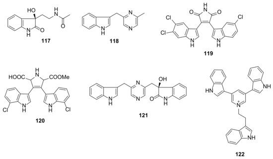 A simple indole alkaloid comprising an oxindole with an amide side chain, named bacilsubteramide A (117) (Figure 13), was isolated from an EtOAc extract of the culture of Bacillus subterraneus 11593, which was collected from the South China Sea with the depth of 2918 m. The structure of 117 was elucidated by 1D and 2D NMR spectral analysis while the absolute configuration of its stereogenic carbon was established by a comparison of the calculated and experimental ECD spectra [44]. Indolepyrazine B (118) (Figure 13) is a pyrazine-containing simple indole, obtained from an extract of a marine-derived Acinetobacter sp. ZZ1275, which was isolated from a mud sample collected from the coastal area of Karachi, Sindh, Pakistan [45].