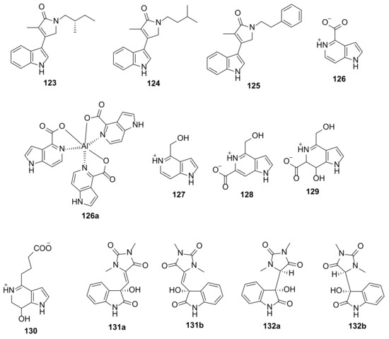 Simple indole alkaloids consisting of an indole nucleus linked to a N-substituted-γ-lactams, named psammocindoles A–C (123–125) (Figure 14), were isolated from a marine sponge Psammocinia vermis (order Dictyoceratida, family Irciniidae) collected from Chuja-do, Korea. The structures of 123–125 were elucidated based on a combination of a high-resolution fast atom bombardment mass spectrometry (HRFABMS) and 1D and 2D spectral analysis. In the case of 123, the absolute configuration of the stereogenic carbon was determined by a comparison of its optical rotation with that of a synthetic version [48].