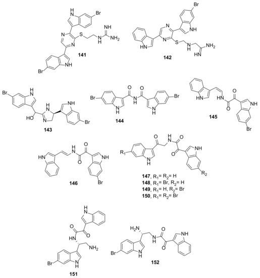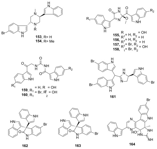 5-Bromotrisindoline (162) and 6-bromotrisi3ndoline (163) (Figure 17) were evaluated for their antitrypanosomal activity against Trypanosoma brucei that causes African trypanosomiasis, also known as sleeping sickness. Compounds 162 and 163 demonstrated moderate antitrypanosomal activity after 48 and 72 h, with IC50 values of 15.36 (48 h) and 13.47 (72 h), and 12.35 (48 h), and 10.27 (72 h) µM, respectively [60],